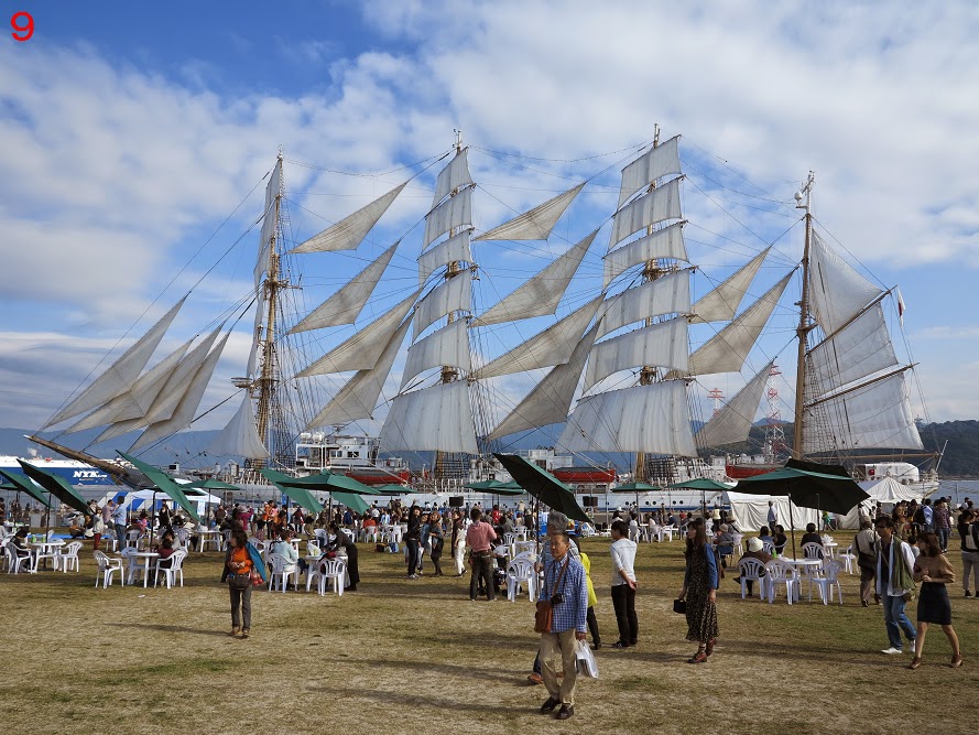 うんで、全ての帆を展開している日本丸と高校の実習船に一般のヨット。